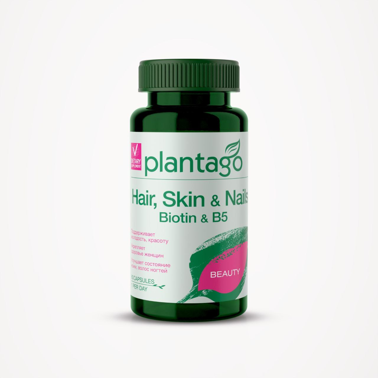 Регулярный прием Plantago Hair, skin & nails Biotin & B5 Витамины для Кожи, Волос и Ногтей поможет заметно сократить возрастные изменения кожи, наладить работу сальных желез, убирая сальный блеск и улучшая общее состояние кожного покрова. Благодаря витаминному комплексу волосы перестают выпадать и ломаться, и укрепляются ногтевые пластины.