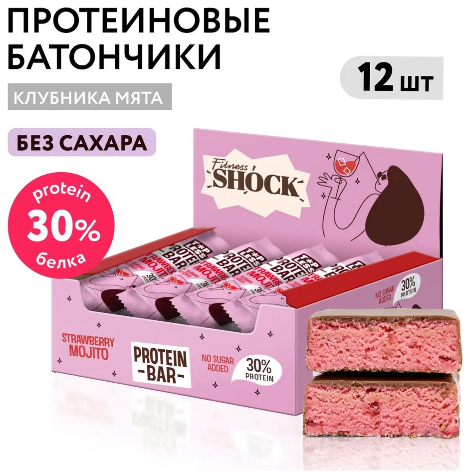 FitnesSHOCK Батончик глазированный (12шт в уп) 40 г "Со вкусом клубники и мяты" до 29.12.2025